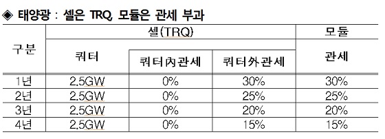 이로써 한국과 중국 등에서 수입한 태양광 셀과 모듈에 대해 2.5GW(기가와트) 이상일 때 첫해 30%의 관세가 부과된다. 수입 태양광 모듈의 경우 쿼터와 상관없이 1년차 30%, 2년차 25%, 3년차 20%, 4년차 15%씩의 관세율이 적용된다.