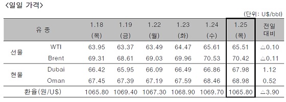 영국 ICE 선물거래소의 브렌트유 3월물 역시 전일대비 배럴당 0.11달러 떨어진 70.42달러에 마감됐다. 두바이유는 전일대비 배럴당 1.12달러 상승한 67.98달러를 기록했다.