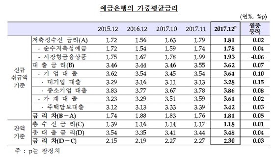 지난해 12월말 잔액기준 총수신금리는 연 1.18%, 총대출금리는 연 3.48%로 각각 전월대비 1bp(0.01%p), 4bp(0.04%p)씩 늘어났다. 총대출금리와 총수신금리 차이는 2.30%포인트로 전월대비 3bp(0.03%p) 확대됐다.