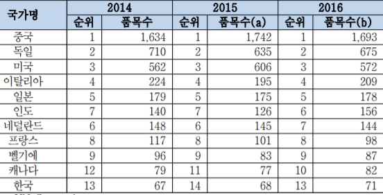 우리나라의 1위 품목 수는 71개로 2015년에 비해 3개 증가했다. 이는 2010년 이후 최고치이며 세계 순위도 전년보다 한 계단 상승한 13위를 차지하였다.