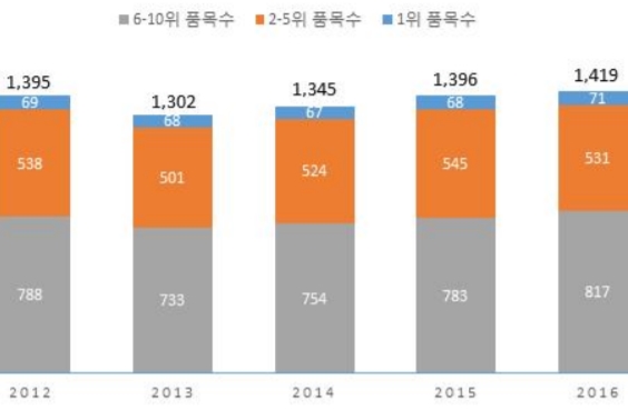 중국은 1위 품목 수가 1693개로 전년보다 49개 줄었다. 중국이 시장점유율 1위 품목 수에서 2005년에 1위로 올라선 이후 감소한 것은 이번이 처음이다.