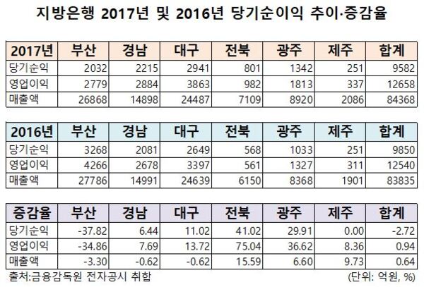 12일 지방은행들이 금융감독원에 제출한 전자공시에 따르면 부산·경남·대구·전북·광주·제주은행 등 국내 6개 지방은행들이 지난해 거둬들인 당기순이익 규모는 총 9582억원이었다. 이는 전년의 9850억원에 비해 2.72%(268억원) 줄어든 규모다.