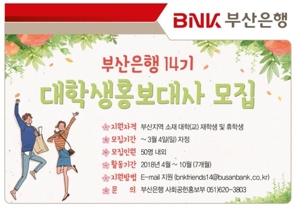 BNK부산은행은 대학생 홍보대사 ‘BNK프렌즈 14기’를 내달 4일까지 모집한다고 19일 밝혔다.