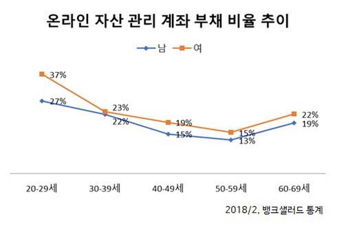 한편 뱅크샐러드에 따르면 남성 기준으로 20대(20~29세)에 27%에 달하는 부채 비율이 30대(30~39세)에 22%, 40대(40~49세) 15%, 50대(50~59세) 13%로 꾸준히 줄었다. 여성의 경우에도 20대 37%, 30대 23%, 40대 19%, 50대 15%로 빠르게 감소했다. 다만 60세 이상 가입자들은 부동산 등 실물 자산을 처분하며 부채 비율이 소폭 상승하는 일반적인 추세를 보였다.