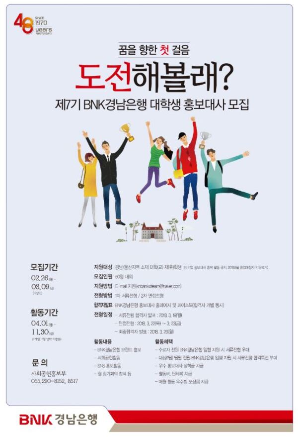 이성철 사회공헌홍보부 부장은 "학업 성적과 대외활동 경험 여부 등 스펙에 관계 없이 열정과 적극성을 가진 지역 대학생이라면 누구나 제7기 BNK경남은행 대학생 홍보대사에 지원 가능하다"며 "체계적인 커리큘럼 속에서 다양한 대학생들과 함께 새로운 경험을 할 수 있는 기회에 반드시 도전해보기를 바란다"고 말했다.