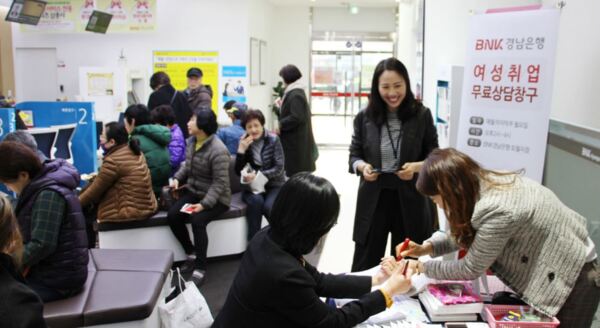 BNK경남은행이 경남여성새로일하기센터와 공동으로 운영하는 찾아가는 여성취업 무료 상담창구를 본점뿐 아니라 영업점에서도 확대 시행한다.