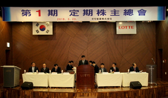 의안 중에 이사 선임의 건에서는 임기 만료된 사내 이사 4명(신동빈, 민명기, 황각규, 김용수) 중에 신동빈, 민명기, 김용수 3명이 재선임됐고, 이재혁 이사는 사내이사로 새로 선임됐다. 임기만료 된 사외이사 2명(송영천, 박용호)은 그대로 재선임됐다.