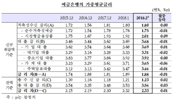 27일 한국은행이 발표한 '2018년 2월중 금융기관 가중평균금리'를 보면 지난달 예금은행의 신규취급액기준 저축성수신금리는 연 1.80%로 전월수준을 유지했으며, 대출금리는 연 3.68%로 전월대비 0.01%포인트(p) 하락했다. 대출금리와 저축성수신금리 차(差)는 1.88%포인트로 지난달에 비해 0.01% 축소됐다.
