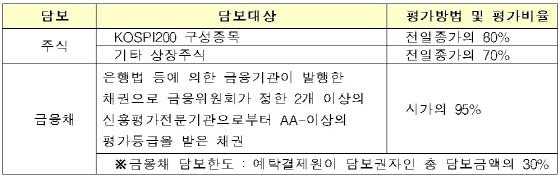 증권대차거래 적격담보 확대 개편으로 주식의 경우 기존 코스피200 종목 뿐 아니라 코스피·코스닥 상장주식 전체가 적격담보에 포함된다.