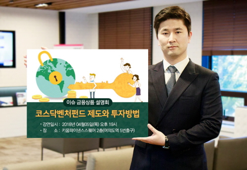 키움증권이 코스닥 벤처펀드 출시 기념 코스닥 벤처펀드 제도와 투자방법, 유망 펀드를 소개하는 설명회를 5일 오후 7시에 여의도 키움파이낸스 2층 교육장에서 개최한다.