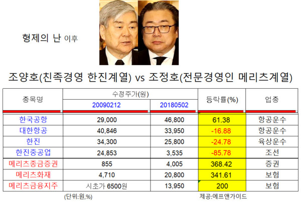 형제기업인 한진그룹과 메리츠금융그룹의 희비가 극명하게 갈렸다. 네 형제(조양호·남호·수호·정호)간의 재산다툼인 2009년 '형제의 난' 이후 장남 조양호 회장이 이끄는 한진그룹은 자녀가 경영을 맡는 친족경영을 택했다. 반면 막내 조정호 회장의 메리츠금융그룹은 전문경영인 체제를 택해 인재 중심의 사업을 꾸렸다.