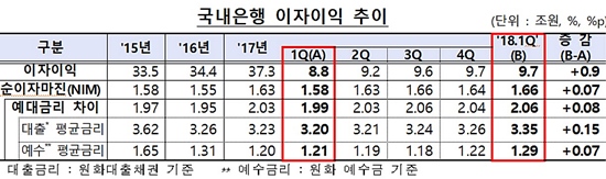 지난 1분기중 국내은행의 이자이익은 9조7000억원으로 전년 동기(8조8000억원)대비 9000억원 증가했다. 금융당국은 대출채권 등 운용자산이 증가(+5.9%)한 가운데 순이자마진이 상승(+0.07%p)한 데 기인한 것으로 봤다.