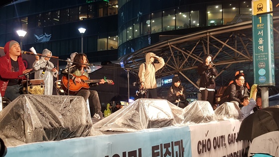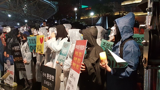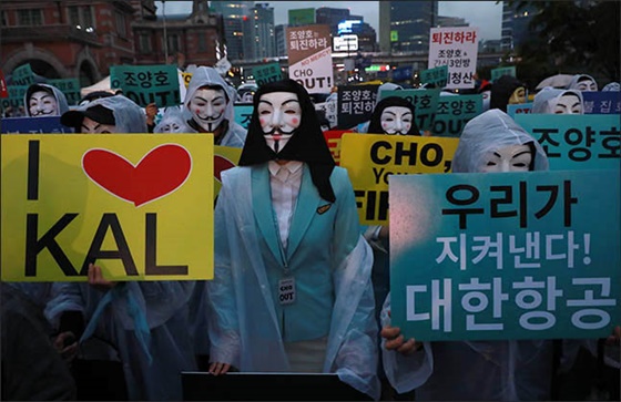 부슬비가 내리는 12일 오후 7시30분 서울역 앞 광장. 승무원 복을 입고 가이포크스 가면을 쓴 대한항공 직원이 무대 위로 올라 목소리를 높였다. 이에 우비를 갖춰 입고 가면을 쓴 500여명의 참가자들은 '조양호 OUT', ’I ♥ KAL'이라고 적힌 플래카드를 흔들며 뜨겁게 화답했다.