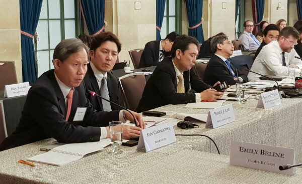 ▶ (왼쪽부터)엄치성 전경련 상무, 로버트 스트레이어 미 국무부 부차관보, 제임스 파드리 미상의 아시아 부회장, 노다 히로부미 일미재계회의 사무국장, 안총기 김&장 고문. [사진=전국경제인연합회] 전국경제인연합회는 15일부터 이틀간 미국 워싱턴D.C에서 미국상공회의소, 일본경단련과 공동으로 '한미일 경제계 전략회의와 한미재계 전략회의'를 개최했다. ▶ '한미일 경제계 전략회의와 한미재계 전략회의'에서 안총기 김&장 고문이 모두발언을 하고 있다. [사진=전국경제인연합회] ▶ [사진=전국경제인연합회]