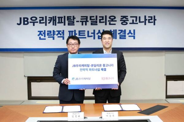 JB금융그룹 JB우리캐피탈은 서울 소재 본사에서 큐딜리온 중고나라와 중고차 사업활성화 등을 위한 전략적 파트너십 체결식을 진행했다고 18일 밝혔다.