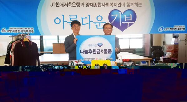JT친애저축은행은 서울시 서초구 소재 양재종합복지관을 찾아 소외 이웃을 위한 생활 물품 기부활동과 후원금을 전달했다고 25일 밝혔다.