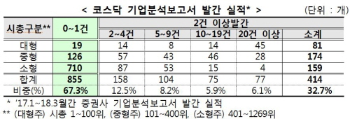 코스닥 상장기업 가운데 증권사 보고서 발간 실적이 없거나 1회인 기업은 855곳이다. 총 상장기업인 1269곳의 67.3% 수준이다.