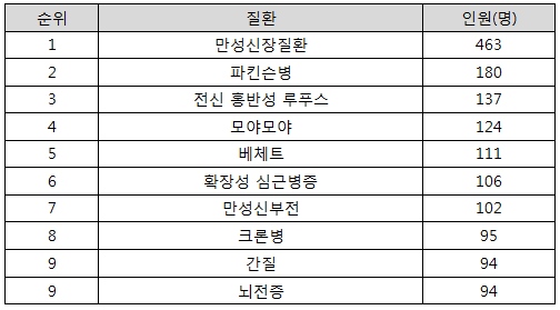 재단에서 지원한 희귀질환 질병 중에서는 만성신장질환(463명, 11.6%)을 앓고 있는 희귀질환자가 가장 많았고, 파킨슨병(180명, 4.5%), 전신 홍반성 루푸스(137명, 3.4%), 모야모야(124명, 3.1%), 베체트(111명, 2.8%) 순으로 주를 이뤘다.
