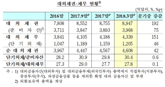한국은행이 30일 발표한 '2018년 3월 말 국제투자 대조표(잠정)'에 따르면 올해 3월 말 한국의 순대외채권은 4608억달러(약 498조원)로 전 분기 대비 42억달러 증가하면서 사상 최대를 기록챘다.