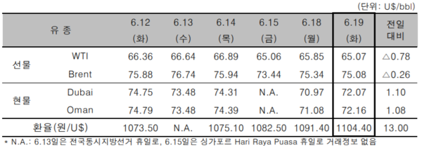 20일 한국석유공사에 따르면 19일(현지시간) 뉴욕상업거래소(NYMEX)의 미국 서부텍사스산원유(WTI) 가격은 전일 대비 배럴당 0.78달러 하락한 65.07달러를 기록했다.