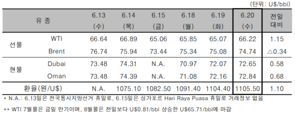 미 원유 재고 감소도 유가에 영향을 미쳤다. 미 에너지정보청(EIA)에 따르면 6월 둘째주 미 원유 재고가 정제투입량 증가의 영향으로 전주대비 약 591만4000배럴 감소한 4억2700만배럴을 기록했다.