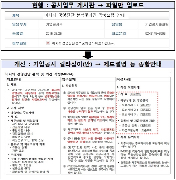 또한 기존 금감원 홈페이지, DART 게시판 등에 산재된 공시업무 자료를 한곳에 모아 이용자가 쉽게 검색할 수 있도록 편성한다.