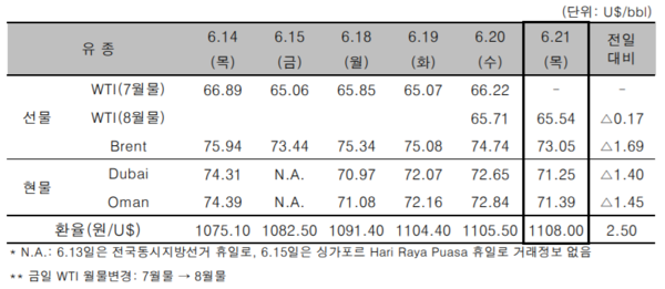 22일 한국석유공사에 따르면 21일(현지시간) 뉴욕상업거래소(NYMEX)의 미국 서부텍사스산원유(WTI) 가격은 전일 대비 배럴당 0.17달러 하락한 65.54달러를 기록했다.