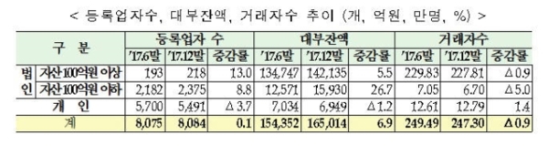 지난해 하반기 대부업체의 대출규모가 반년 만에 1조원 이상 불어났다. 대형 대부업체들의 영업 확대와 P2P대출 시장 성장으로 전체 대출 잔액이 늘어나서다. 이 기간 대부업체는 9개 늘어난 8084개에 달했다.