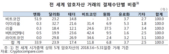 전 세계 암호자산 거래의 결제수단별 비중은 엔화(33.9%), 달러화(23.9%), 테더(17.4%), 비트코인(11.8%), 원화(6.8%) 등의 순이다.