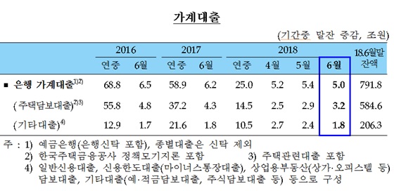 한국은행이 11일 발표한 '2018년 6월 중 금융시장 동향'에 따르면 은행의 가계대출 규모는 791조8000억원으로 전월 대비 5조원 증가했다.