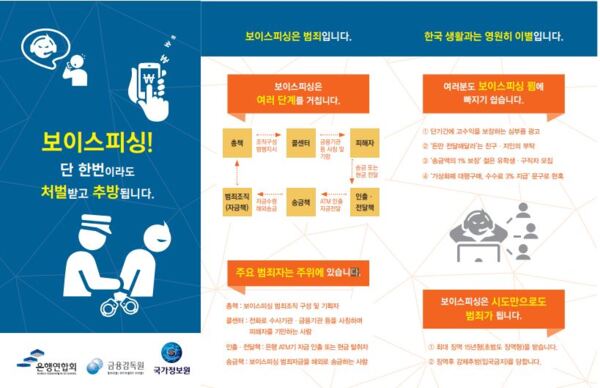 은행연합회·금융감독원·국가정보원은 민·관 합동으로 보이스피싱 범죄 가담 우려 대상의 경각심 고취 및 선제적 범죄 예방을 위한 팜플렛(한국어·영어·중국어)을 제작·배포하게 됐다.