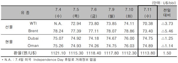 반면, 미 원유재고 감소는 유가 하락폭을 제한했다. 미 에너지정보청(EIA)에 따르면 7월 첫째주 미 원유재고가 4억500만배럴을 기록하며 전주 대비 1263만배럴 감소했다. 이 같은 감소폭은 2016년 9월 1451만3000배럴 이후 최대치이다.