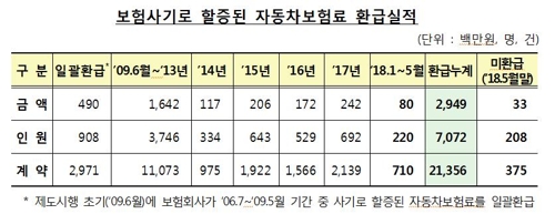 208명은 할증 보험료 3억3000만원을 아직 돌려받지 못했다. 금감원은 전화번호가 바뀌면서 연락이 닿지 않아 돌려주지 못했다고 설명했다.