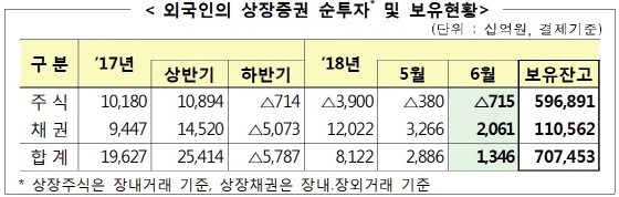 지난 4월 2조2040억원의 주식을 순매도하며 매도세로 돌아선 외국인은 5월(3800억원)에 이어 6월에도 7150억원을 내다팔았다. 이에 따라 보유금액도 596.9조원으로 600조원선이 무너졌다.