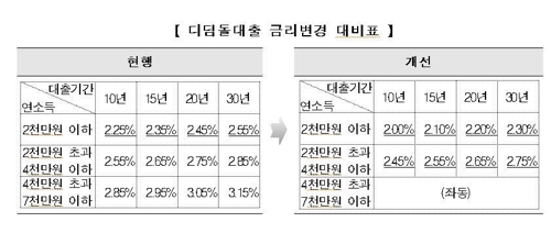 현재 디딤돌대출 금리는 부부합산 연소득과 대출기간을 고려해 연 2.25∼3.15% 범위로 적용하고 있다.