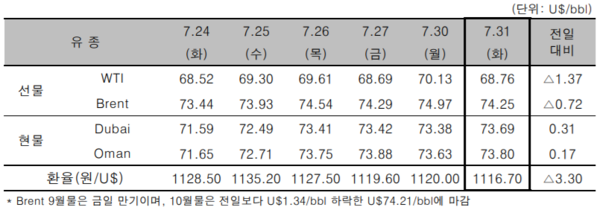 1일 한국석유공사에 따르면 7월31일 기준 뉴욕상업거래소(NYMEX)의 미국 서부텍사스산원유(WTI) 가격은 전일 대비 배럴당 1.37달러 하락한 68.76달러를 기록했다.