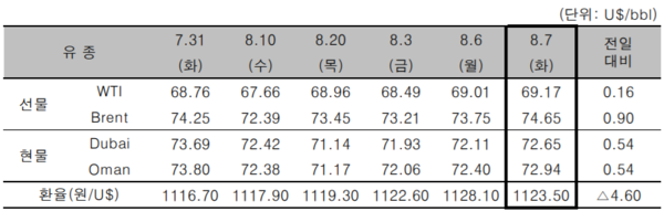 미 원유 재고가 줄어든 것으로 추정되는 점도 유가 상승 요인으로 작용했다. 로이터통신에 따르면 8월 첫째주 미 원유 재고는 전주 대비 약 333만배럴 감소한 4억500만배럴을 기록한 것으로 추정된다.