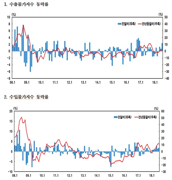 지난해 같은 달과 견줘보면 수입물가는 12.2%, 수출물가는 2.6% 각각 상승했다.