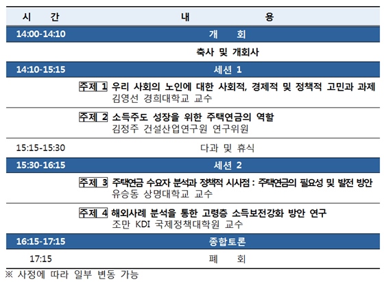 '국민의 행복한 노후 생활을 위한 주택연금 발전방안'을 주제로 열리는 이번 세미나는 △김영선 경희대학교 교수의 '우리 사회의 노인에 대한 사회적, 경제적 및 정책적 고민과 과제' △김정주 건설산업연구원 연구위원의 '소득주도 성장을 위한 주택연금의 역할' △유승동 상명대학교 교수의 '주택연금 수요자 분석과 정책적 시사점' △조만 KDI 국제정책대학원 교수의 '해외사례 분석을 통한 고령층 소득보전강화 방안 연구' 등 4개의 주제로 구성돼 있다.