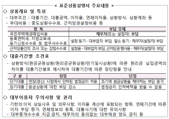 이에 따라 도입되는 표준상품설명서는 대부계약 조건 외에 대출금 상환방식, 대출기간 등에 따른 대부이용자 부담 금액 등을 비교 예시함으로써 소비자 선택권을 강화한다. 구체적으로 대부이용자 부담 비용, 중도상환수수료 여부, 대부이용자의 권리 등을 명시한다.