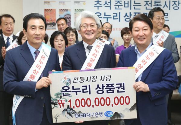 DGB금융그룹은 민족 최대명절인 추석을 앞두고 DGB대구은행 시청영업부에서 진행된 '추석맞이 온누리상품권 판매 촉진행사'에서 10억원 상당의 상품권 구매약정을 했다고 11일 밝혔다.