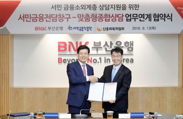 BNK부산은행은 서민금융진흥원, 신용회복위원회와 '서민·금융취약계층·영세자영업자 상담지원을 위한 업무협약'을 체결하고 모든 영업점에 서민·영세자영업자 '헬프 데스크(Help-Desk)'를 운용한다고 13일 밝혔다.