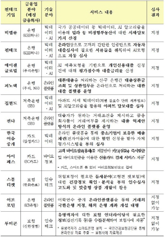 구체적으로는 빅데이터, AI기술 등을 활용해 담보평가(부동산, 자동차 등), 개인신용분석, 어음할인 및 보험인수 심사 등의 서비스 제공이 6건이며 온라인 플랫폼을 이용한 비대면 대환대출 서비스 및 소비자가 대출을 직접 제안하는 서비스 제공이 2건, 바이오정보를 활용한 신용카드 발급 및 결제서비스 제공이 1건이다.