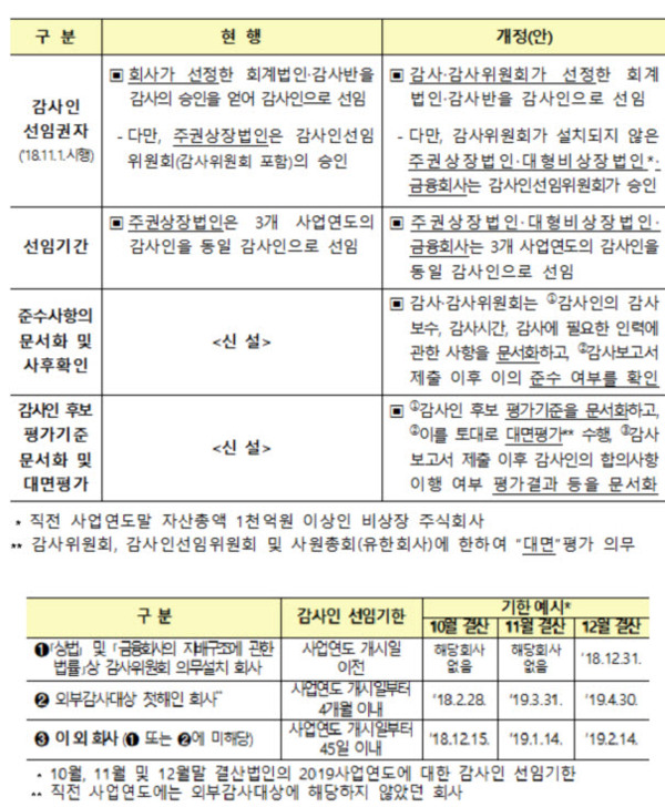 금감원에 따르면 외감법 개정으로 11월부터는 사업연도 개시일부터 '4개월 이내'로 일률 적용돼온 감사인 선임기한이 회사 특성에 따라서는 '45일 이내' 등으로 단축된다.