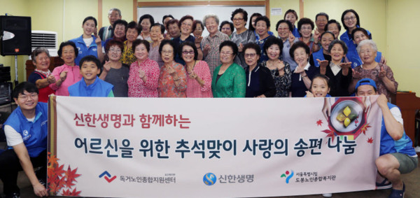 신한생명 관계자는 "한가위를 앞두고 따뜻한 정과 행복을 어르신과 함께 나누고 싶어 이번 활동을 준비했다"며, "앞으로도 경제적, 정서적으로 취약한 소외계층에게 행복을 전할 수 있도록 다양한 사회공헌 활동을 진행 하겠다"고 전했다.