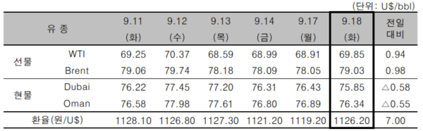 유럽거래소(ICE)의 브렌트유(Brent) 가격은 전일 대비 배럴당 0.98달러 상승한 79.03달러에 마감했다.