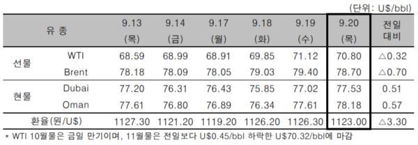 유럽거래소(ICE)의 브렌트유(Brent) 가격은 전일 대비 배럴당 0.70달러 하락한 78.70달러에 마감했다.