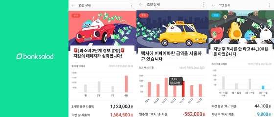 뱅크샐러드 금융비서 서비스를 이용하면 택시비, 카페, 카드할부, 음주, 온라인쇼핑 등 다양한 지출영역에서 밀착 관리를 받을 수 있다. 예를 들어, 택시비 지출 규모가 커지면 '택시에 어마어마한 금액을 지출하고 있습니다'는 경고 메시지가 뜨고, 반대로 동일한 항목에서 지출이 줄면 '이번 주에는 택시를 안 타고 1만원을 아꼈습니다' 등과 같은 칭찬 알림을 볼 수 있다.