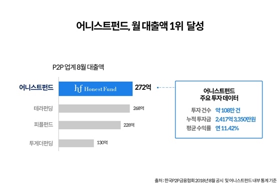 한국P2P금융협회 공시자료에 따르면 어니스트펀드는 8월 한 달 간 272억원의 신규 대출을 실행, P2P업계 중 가장 큰 규모의 월 거래액을 점유했다. 9월 19일 기준 누적 투자금 2417억원, 평균 수익률 연 11.42%, 누적 투자건수 108만건 등 우수한 실적을 기록했다.
