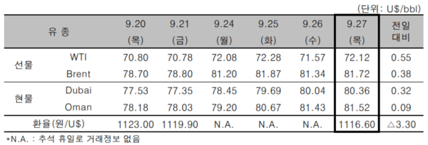 유럽거래소(ICE)의 브렌트유(Brent) 가격은 전일 대비 배럴당 0.38달러 상승한 81.71달러에 마감했다.
